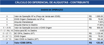 | Quadro 2 – Exemplo do cálculo do DIFAL a ser efetuado por remetente de outra UF (SP) em operação de venda a consumidor final mato-grossense não contribuinte do ICMS | ||